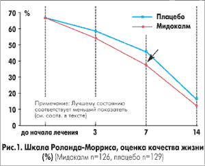 Как показал анализ приведенного клинического исследования, Мидокалм вызывал достоверно более значимое улучшение качества жизни в сравнении с плацебо. Отличный результат отмечался в оценке вопросов шкалы Роланда-Морриса, связанных с возможностями двигательной активности. Кроме того, выявлены достоверные различия в субъективной оценке эффективности лечения. При терапии Мидокалмом срок пребывания на больничном листе сокращался в среднем на 1-2 дня. Все эти наблюдения подтверждают, что при синдроме острой поясничной боли применение Мидокалма значительно ускоряет процесс выздоровления, способствуя ранней мобилизации больных и быстрейшему возвращению их трудоспособности.