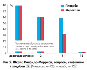 За две недели исследования в обеих группах уменьшилась боль (р<0,001) и увеличился диапазон движений. У больных, принимавших Мидокалм, изменение этих двух параметров протекало более благоприятно, и к концу исследования в этой группе у большинства жалобы практически исчезли, однако разница между двумя группами статистически не была достоверной. В то же время уже через неделю после начала лечения по качеству жизни была заметна статистически достоверная разница в пользу группы, принимающей Мидокалм (р<0,034), и эта положительная тенденция сохранялась до окончания исследования (рис. 1). По шкале Роланда-Морриса дифференцированно анализировали группы вопросов, относящихся к отдельным видам деятельности. При этом наиболее выраженные различия между двумя группами больных выявлены в способности к передвижению и другим видам двигательной активности (р<0,021, рис. 2).