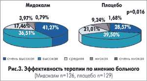 Значимость результатов, выявленных относительно динамики качества жизни, подтверждает тот факт, что в группе, получавших Мидокалм, удовлетворенность лечением статистически была достоверно выше по сравнению с тем, как его оценивали больные группы плацебо (р<0,016, рис. 3).