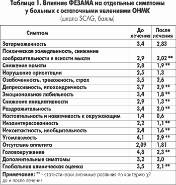 Степень выраженности двигательных нарушений (расстройство ходьбы, объем самообслуживания, степень пареза) соответствовала специфической локализации ишемического очага в полушариях мозга и интенсивности гидроцефально-атрофических изменений. Сравнительный анализ неврологической симптоматики до и после лечения ФЕЗАМОМ показал улучшение функционального состояния таких систем, как пирамидная и чувствительная. У 15 больных наблюдался регресс двигательных нарушений, у 7 — улучшение двигательных функций было незначительным. При анализе церебральных расстройств по шкале «SCAG» у больных, перенесших ишемический инсульт в резидуальный период, отмечались множественные нарушения субъективной неврологической симптоматики и психоэмоциональной сферы. Наиболее были выражены нарушение памяти на текущие события (2,8 балла), головокружение (4,8 балла), депрессивность (3,7 балла) и утомляемость (4,1 балла). Субъективные церебральные расстройства являются проявлением дисциркуляторной атеросклеротической энцефалопатии, а также локальных изменений метаболизма и гемодинамики в зоне ишемии, сформировавшейся как результат перенесенного острого нарушения мозгового кровообращения. После курсового применения ФЕЗАМА интенсивность и частота церебральных симптомов уменьшилась (табл. 1). Наиболее были выражены снижение эмоциональной лабильности, раздражительности, головокружения. Нейропсихологический контроль выявил повышение активности психических процессов у больных после приема ФЕЗАМА. Так, до лечения больные выполняли пробы Шульта за 95 секунд, после лечения — за 78.