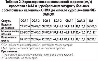 Под влиянием ФЕЗАМА у больных отмечено увеличение линейной систолической скорости кровотока (ЛССК) в экстра- и интракраниальных сосудах. Однако статистически достоверное увеличение ЛССК под влиянием ФЕЗАМА констатировалось только во внутренней сонной, средней мозговой и основной артериях интактного полушария. Изменение скорости кровотока в сосудах пораженного полушария было менее выражено (табл. 2).
