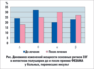 ФЕЗАМ оказывает влияние на частотно-амплитудные показатели биоэлектрической активности головного мозга как в интактном, так и в пораженном полушарии (рис.). У больных до лечения в общей структуре ЭЭГ интенсивность в диапазоне тета-ритма в интактном полушарии составляла 32%, дельта-ритма — 24%; альфа-ритма — 20%. После курсового приема ФЕЗАМА отмечены смещение интенсивности в сторону альфа-ритма (30%) и бета-ритма (27%) и снижение интенсивности медленных ритмов (дельта- и тета-, соответственно 18% и 25%). В пораженном полушарии ФЕЗАМ уменьшал степень дезорганизации и размеры патологической активности в центрально-теменной области. Сдвиг в структуре интенсивностей основных ритмов ЭЭГ в пораженном полушарии статистически не достоверен.