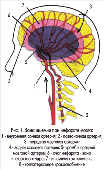 Ишемическая полутень — это область ишемизированной, но жизнеспособной ткани мозга, которая окружает зону инфарктного ядра, то есть это ткань в состоянии риска (рис. 1), кровоток в ней находится между двумя ишемическими порогами и соответствует мизерной или критической перфузии, что не обеспечивает метаболические запросы ткани мозга. Структурно-морфологическая организация нейронов этой области сохранена, но имеется дефект ее функциональной активности — утрата электрической функции нейронов.