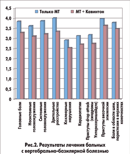 Из таблицы видно, что включение в комплекс терапии больных с ВББ кавинтона по отработанной нами схеме статистически достоверно улучшает результаты лечения по основным клиническим показателям. Статистическая недостоверность отмечена в отношении болевых синдромов в области шеи и приступов височной эпилепсии. Статистическая недостоверность в отношении приступов височной эпилепсии, вероятно, связана с однонаправленным влиянием МТ и кавинтона. В предыдущих исследованиях [21] нами получена высокая степень достоверности (r 0,3, р<0,001) по урежению и снижению интенсивности приступов с височной эпилепсией при включении в комплекс лечения МТ.