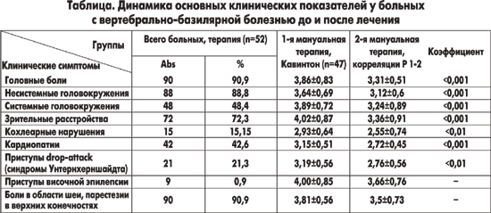 В таблице приведена динамика основных клинических признаков у больных с ВББ до и после лечения в 1-й (мануальная терапия) и 2-й (мануальная терапия и кавинтон) группах больных.