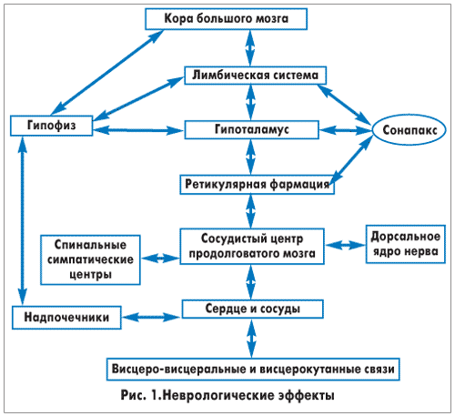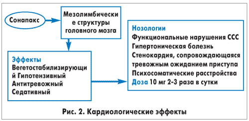 Сонапакс широко используют для лечения функциональных нарушений сердечно-сосудистой системы психоневрологического характера. Как правило, успех приносит терапия малыми дозами — 10-50 мг в сутки в 2-3 приема (сначала назначают минимальную дозу, при необходимости ее постепенно увеличивают). Сонапакс более выраженно, чем транквилизаторы, влияет на кардиалгический синдром. Начальный терапевтический эффект при лечении Сонапаксом отмечается обычно в первые 5-6 дней, курс лечения — индивидуален (от нескольких недель до месяцев). Наряду с функциональными нарушениями сердечно-сосудистой системы, показаниями к психофармакотерапии являются органические заболевания системы кровообращения. При ишемической болезни сердца Сонапакс осуществляет лечебный эффект в тех случаях, когда приступы возникают как психовегетативная реакция на эмоциональный стресс: снижается неадекватно увеличенная психовегетативная реактивность, реже наступают приступы. Сонапакс используют в малых дозах (10 мг 2-3 раза в сутки), учитывая нередко низкую толерантность к нему при соматической патологии. При инфаркте миокарда в первые часы заболевания действие нейролептиков и транквилизаторов обусловливает снижение аффективной восприимчивости, чувства страха смерти, психомоторного возбуждения. Обладая заметным влиянием на вегетативные функции, Сонапакс оказывает нормализующее действие на вегетативные сдвиги, сопровождающие соматические нарушения и психический стресс. Имеет значение также потенцирование действия аналгетиков и снотворных средств. Сонапакс обладает α-адреноблокирующими свойствами, уменьшает гипоксию, развивающуюся в первые сутки инфаркта миокарда при повышении катехоламинов в крови, кроме того, снижает системное артериальное давление. В постинфарктном периоде при астеноневротическом синдроме с утомляемостью, раздражительностью, нарушениями сна и вегетативными расстройствами лечение проводят главным образом с помощью мягких нейролептиков (рис. 2).