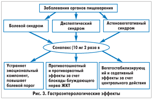 Функциональные сердечно-сосудистые расстройства психовегетативной природы могут сопровождаться нередко выраженными аффективными нарушениями депрессивного характера: снижение настроения, круга интересов, пессимистическое отношение к перспективе выздоровления. Если эти симптомы возникают в рамках так называемой невротической депрессии, они купируются, как правило, при лечении Сонапаксом (табл.). Сонапакс также широко рекомендован при заболеваниях органов пищеварения (рис. 3).