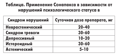 Учитывая многолетний опыт использования препарата, эффективность и безопасность, проверенную не одним поколением врачей, Сонапакс рекомендован как средство выбора для лечения вегетативных дисфункций в практике врачей терапевтического профиля.