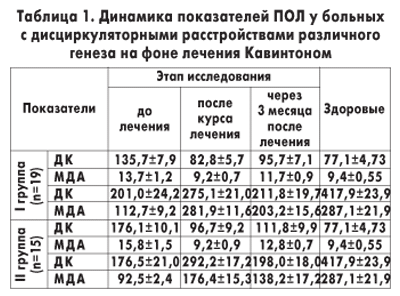 Усиление процессов свободнорадикального окисления является одним из ведущих факторов клеточной альтерации при сосудистой патологии. По многочисленным наблюдениям, у больных с дисциркуляторными расстройствами нарушается равновесие между перекисным окислением липидов (ПОЛ) и антиоксидантной обеспеченностью организма (АОО) в сторону усиления процессов ПОЛ и уменьшения АОО [10, 12, 16, 17, 20, 21, 28, 31, 33]. Токсичные продукты ПОЛ повреждают клетки эндотелия и интимы сосудов, оказывают супрессивное влияние на выработку простагландинов [12] и провоцируют спастические реакции. Перекиси липидов способствуют агрегации тромбоцитов и тромбообразованию. Все это усугубляет реологические и микроциркуляторные нарушения у больных [6, 26].