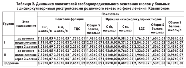 Существенные изменения претерпела под воздействием Кавинтона система тиоловых соединений (табл. 2). Активность свободнорадикального окисления белков и низкомолекулярных тиолов снизилась, что отразилось в достоверном (р<0,05) приросте ТДС в обеих группах пациентов. При этом наметилась тенденция к перераспределению серы в пользу SH-групп белков, возможно, за счет трансмиссии глутатиона из фракции низкомолекулярных тиолов в состав белковых молекул. Эта динамика свидетельствовала о возросшей антиокислительной защищенности белков. Учитывая неизменные уровни общей серы тиолов и общего белка крови (после лечения его уровень составил 73,1±0,7 г/л), можно предположить и конформационную демаскировку SH-групп в белковых молекулах. Причиной увеличения числа белковых SH-групп чаще всего является увеличение активности глюкозо-6-фосфатдегидрогеназы основного поставщика НАДФ-Н2, необходимого для поддержания тиоловых групп в восстановленном состоянии [7]. Именно этот ферментативный феномен можно рассматривать как наиболее вероятную точку приложения действия Кавинтона, учитывая известные его свойства в отношении энергетического метаболизма клеток [13].