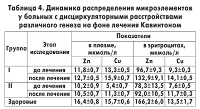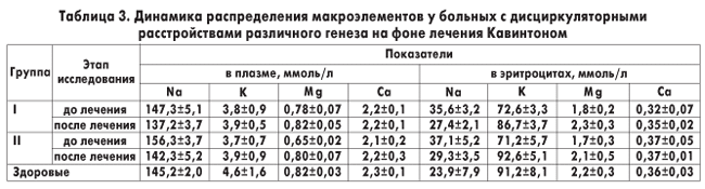 Заслуживает внимания выявленная в исследовании динамика перераспределения макро- и микроэлементов в различных средах под влиянием Кавинтона (табл. 3, 4). У больных восстановился баланс Ca и Mg, наметилось восстановление распределения Na и K в плазме и во внутриклеточной среде.