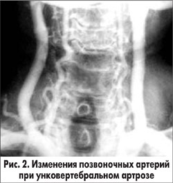 К анатомическим особенностям шейного отдела относится расположение позвоночных артерий в отверстиях костного канала поперечных отростков шейных позвонков (рис. 1), легко смещающихся относительно друг друга при движениях головы и шеи (Верещагин Н.В., 2003). Артерии тесно прилегают к телам позвонков. При этом даже в обычных физиологических условиях происходит компрессия и ограничение кровотока в одной или обеих артериях. При остеохондрозе шейного отдела часто развивается нестабильность (патологическая подвижность тел позвонков), формируются краевые костные разрастания, унковертебральный артроз, которые приводят к раздражению сплетения позвоночных артерий или их компрессии, развитию недостаточности в вертебро-базилярной системе (рис. 2). Компрессия позвоночных артерий возможна также мышцами шеи (лестничными, длинной мышцей шеи, нижней косой мышцей головы), костными образованиями (при врожденных аномалиях, например платибазии).