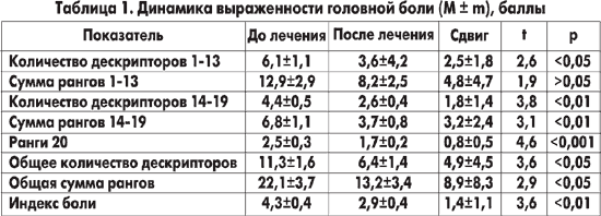 Анализ показателей Мак-Гилловского опросника боли свидетельствует о положительном влиянии применяемого лечебного комплекса на структуру и выраженность головной боли (табл. 1).