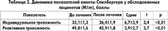Снижение интенсивности и частоты головокружений способствовало улучшению эмоционального состояния пациентов, о чем свидетельствовали показатели анкеты Спилбергера в модификации Ханина. Отмечено достоверное снижение уровня индивидуальной и реактивной тревожности (табл. 2).