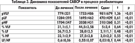 По данным САВСР, проведенного до лечения у обследованных пациентов, выявлено повышение тонуса симпатической и парасимпатической нервной систем. После проведенного лечения достоверных изменений показателей САВСР не отмечалось (табл. 3).
