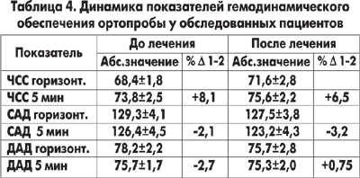 При проведении активной ортостатической пробы выявлено нарушение гемодинамического ее обеспечения у 9 обследованных. У них регистрировался гипосимпатикотонический тип реакции на ортостаз (снижение САД более чем на 10-15 мм рт. ст.; реакция ДАД неспецифична: возможно как снижение, так и повышение ДАД; ЧСС учащается незначительно или урежается). После лечения структура гемодинамического обеспечения ортопробы претерпела некоторые изменения: у 7 пациенток с исходным гипосимпатикотоническим типом реакции был выявлен нормотонический тип реакции. У 2 обследованных с исходным недостаточным гемодинамическим обеспечением ортопробы показатели после лечения не изменились. У 1 пациентки, исходная реакция которой на ортостаз была нормальной, после лечения имел место гипосимпатикотонический тип реагирования. В таблице 4 представлена динамика показателей ЧСС и АД у обследованных.
