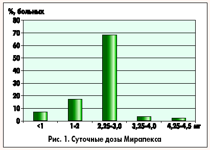 Подбор оптимальной суточной дозы Мирапекса проводили на протяжении нескольких недель с медленной титрацией разовой дозы от 0,125 мг вплоть до 1,5 мг препарата и повышением общей суточной дозы в среднем на 0,25-0,5 мг один раз в 5-7 дней (при 3-кратном приеме). Распределение больных в соответствии с окончательными суточными дозами Мирапекса показано на рисунке 1.