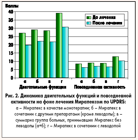 Общие результаты лечения Мирапексом в основной подгруппе пациентов с болезнью Паркинсона представлены на рисунке 2. На диаграмме показана динамика двигательных функций (раздел III UPDRS) и повседневной активности (раздел II этой шкалы) у больных, которым проводили монотерапию данным препаратом и применяли комбинации с другими антипаркинсоническими средствами. Как видим, у пациентов с болезнью Паркинсона определялся отчетливый положительный эффект Мирапекса во всех анализируемых подгруппах (в т. ч. на фоне монотерапии в начальной стадии болезни), проявлявшийся достоверным снижением суммарного балла тяжести двигательных нарушений.