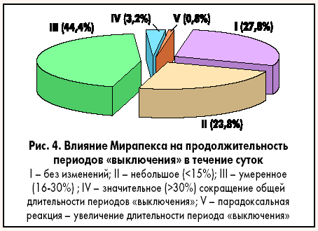 У больных, принимавших препараты леводопы, проведен анализ влияния Мирапекса на продолжительность периодов «выключения» в течение суток (рис. 4). В группе пациентов с болезнью Паркинсона сокращение совокупного времени периодов «выключения» имело место у 90 (71,4%) больных из 126 с феноменом «включение-выключение», причем степень сокращения варьировала от 7 до 83% (в среднем 36%); в большинстве случаев (44,4%) преобладало умеренное сокращение длительности таких периодов. Лишь у одного больного (0,8%) отмечена парадоксальная реакция – увеличение продолжительности периода «выключения» на 52%.