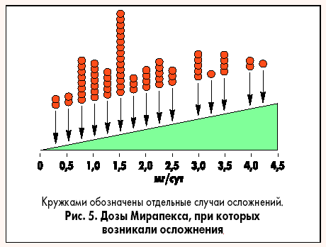 В целом же при обеих изучаемых формах первичного паркинсонизма мы отметили хорошую переносимость Мирапекса на фоне его длительного приема. Те или иные побочные эффекты, ни в одном из случаев не носившие угрожающего характера, наблюдались у 67 (16,7%) больных: артериальная гипотензия (26) и гипертензия (7), зрительные галлюцинации и дезориентация (17), психомоторное возбуждение (6), отек ног (5), дневная сонливость (5), фрагментация ночного сна и ночные кошмары (4), усиление тремора и гипокинезии (3), рвота (2), судороги мышц рук и шеи (1), дизурические расстройства (1), аллергические высыпания на коже (1). Помимо этого, в ряде случаев в начале повышения дозы Мирапекса отмечалась преходящая тошнота. У 2 женщин при назначении препарата было зарегистрировано уменьшение выраженности климактерического синдрома, что, по-видимому, можно объяснить воздействием препарата на гипоталамические дофаминовые рецепторы и связанный с этим нейроэндокринный эффект. Согласно рисунку 5 побочные эффекты обычно возникали уже при назначении невысоких доз Мирапекса, что позволяет даже в ранней стадии лечения отслеживать их динамику и своевременно принимать необходимые меры (более медленное наращивание или «замораживание» дозы, реже ее снижение, назначение корректоров – домперидона и др.). В случае хорошей переносимости препарата в начальной стадии лечения дальнейшее повышение дозы обычно не вызывало каких-либо дополнительных проблем.