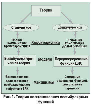 Такая разница между компенсацией нарушений статических и динамических функций четко свидетельствует о том, что в процесс их восстановления вовлечены различные механизмы нейропластичности. Действительно, накопленные к настоящему времени литературные данные отражают две основные теории, объясняющие функциональное восстановление после односторонней утраты вестибулярных функций (рис. 1).