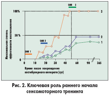На рисунке 2 рассмотрено влияние кратковременного ограничения сенсомоторной активности (SMR) на профиль восстановления динамической функции равновесия после односторонней вестибулярной невротомии у кошки. Модель SMR использована для воспроизведения поведения пациента с болезнью Меньера, соблюдающего постельный режим в течение 1 недели после проведения подобной операции. 7-дневное SMR было смоделировано в период острой стадии (день 0-7: SMR 1), компенсаторной стадии (день 14-21: SMR 2) и после полного восстановления (день 42-49) максимальной степени эффективности двигательных функций кошки при их изучении с помощью специального вращательного аппарата. Следует отметить, что задержка в профиле восстановления вызвана недостатком ранней сенсомоторной активности (SMR 1 и SMR 2) по сравнению с кошкой, не подвергавшейся ограничению активности (SMR 3). Аналогичные наблюдения сделаны и в отношении окончательной степени восстановления, которая при отсутствии раннего сенсомоторного тренинга остается очень низкой (40 и 50% для SMR 1 и SMR 2 соответственно) (C. Xerri, M. Lacour, 1980).