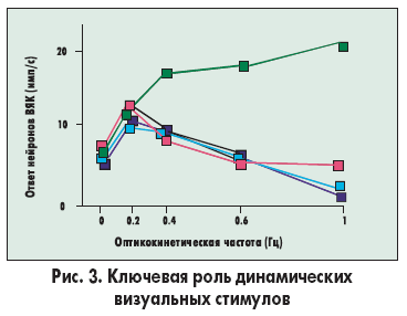 Вестибулярные клетки, расположенные в пределах ВЯК и имеющие нисходящие проекции на спинальные мотонейроны, в течение первых трех недель стали более чувствительны к быстрому визуальному движению окружающих предметов у кошек, получающих только динамические визуальные стимулы (рис. 3).