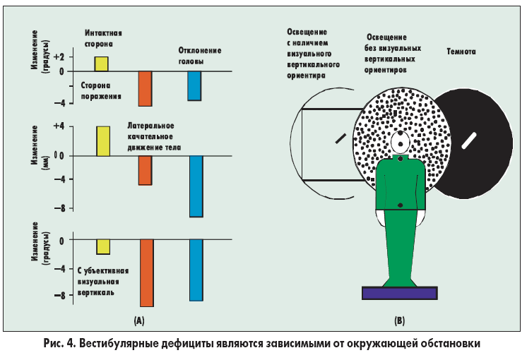 На рисунке 4А приведены средние результаты, полученные в группе из 27 пациентов с болезнью Меньера, обследованных через 1 неделю после выполненной с лечебной целью односторонней вестибулярной невротомии. В условиях полной темноты направление отклонения головы, латеральное качательное движение тела и субъективное восприятие вертикали смещались в сторону поражения в темноте. В условиях освещения и отсутствия визуального вертикального ориентира каких-либо изменений указанных отклонений и их амплитуды не происходило. Напротив, при наличии освещения и визуального ориентира вертикальной плоскости все нарушения становились обратимыми (отклонение головы, латеральное качательное движение тела) или значительно уменьшались (субъективная визуальная вертикаль) (L. Borel et al., 2001).