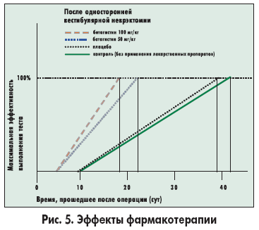 Высокоэффективными в лечении пациентов с головокружением оказались препараты, воздействующие на гистаминергическую систему. Бетагистин (Бетасерк®) – структурный аналог гистамина – не обладает седативным эффектом и выражено улучшает вестибулярную компенсацию, что было показано в исследованиях на кошках (рис. 5).