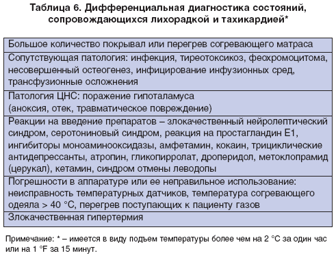 Эпизоды увеличения частоты сердечных сокращений или повышения температуры (более чем на 2 °С в час или 1 °F за 15 минут) также должны быть подвергнуты тщательному анализу. Не связанные с ЗГ причины должны быть быстро выявлены и устранены (табл. 6). Особое внимание необходимо обращать на то, что при интоксикации кокаином возникает состояние гиперметаболизма, которое сопровождается тахикардией, лихорадкой, ригидностью мышц, о чем необходимо помнить при проведении дифференциального диагноза [30].