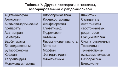 Повышение температуры тела может оказаться достаточно поздним симптомом ЗГ. Нужно отметить, что особую диагностическую ценность имеет не столько высокая температура кожных покровов, сколько молниеносный темп ее нарастания [29, 30]. В результате обширного рабдомиолиза развиваются миоглобинемия и миоглобинурия, клинически проявляющиеся тем, что моча приобретает цвет «кока-колы». На поздней стадии ЗГ может развиться тяжелая коагулопатия, проявляющаяся, как правило, синдромом ДВС. Угроза обширного кровотечения требует тщательного наблюдения за свертывающей системой крови. Смерть при ЗГ может наступить в результате остановки сердца, повреждения головного мозга, внутреннего кровотечения или поражения других систем организма. В плане дифференциальной диагностики следует помнить, что рабдомиолиз может развиться через несколько недель после введения больших доз аминокапроновой кислоты (30 г/сут), сопровождаясь слабостью в проксимальных отделах мышц, пусковыми механизмами рабдомиолиза, в этом случае проявляются дефицит карнитина и ишемия (табл. 7).