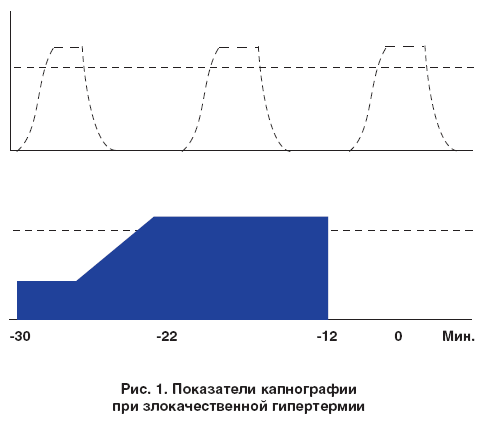 В большинстве современных источников самым ранним признаком ЗГ называют быстрый рост уровня СО2 в конце выдоха – ЕtСО2 [16, 17], поэтому мониторирование СО2 (капнография) является быстродействующим индикатором злокачественной гипертермии. Мониторы СО2 обычно отображают кривую изменения концентрации СО2 каждого выдоха в реальном времени (капнограмму) и тренд