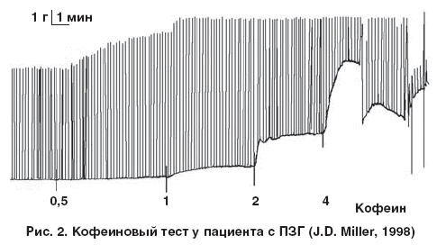 Кофеиновый тест [42] проводят следующим образом: мышечное волокно помещают в раствор кофеина с концентрацией 2 ммоль/л, в норме его разрыв происходит при прикладывании к мышечному волокну усилия в 0,2 г; при ПЗГ разрыв происходит при усилии в > 0,3 г (рис. 2).