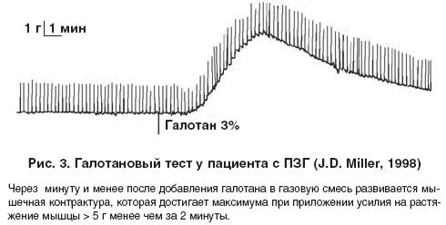 Галотановый тест проводят так: мышечное волокно помещают в контейнер с физиологическим раствором, через который пропускают смесь кислорода и углекислого газа. Исследуемое мышечное волокно стимулируется электрическим разрядом каждые 10 секунд. Сила сокращения мышцы регистрируется электронным прибором и графически отображается на бумаге. Затем к смеси газов добавляют галотан. В норме мышечное волокно не будет изменять силу сокращения при приложении усилия > 0,5 г в течение всего времени присутствия галотана в газовой смеси, пропускаемой через физиологический раствор в контейнере. При снижении концентрации галотана в окружающей мышечное волокно среде на 3% точка разрыва волокна падает с > 0,7 до > 0,5 г (рис. 3). Все это позволяет утверждать, что любое отклонение от заранее установленной нормальной точки разрыва делает тест чувствительным на 100% и на 78% специфичным (22% ошибочных результатов).