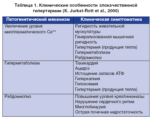Этиопатогенез. В настоящее время известно, что основной патофизиологический механизм при ЗГ состоит в освобождении избыточного количества калия из саркоплазматического ретикулума (табл. 1). Избыток калия в цитоплазме миоцитов запускает цепь гиперметаболических реакций, которые включают в себя активацию контрактильных элементов, гидролиз АТФ, образование тепла, СО2 и лактата, поглощение кислорода, разобщение процессов оксидации и фосфорилирования, конечное разрушение клетки с высвобождением внутриклеточного содержимого (креатинкиназы, К+, Са++ и миоглобина). Повышение содержания в крови концентрации К+ приводит к нарушению сердечного ритма и может стать причиной остановки сердца.