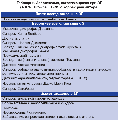В настоящее время в мировой литературе накоплен большой клинический материал, позволяющий заключить, что из нервно-мышечных заболеваний наиболее часто ассоциированы с развитием ЗГ во время общей анестезии синдром Кинга-Денборо, болезнь центральных волокон, мышечная дистрофия Дюшенна, конгенитальная рецессивная мышечная дистрофия Фукуямы (мутация 9q31-q33), миотония Томсена (мутация 7q35), синдромы Шварца-Джампела (мутация 1p34) и Сатойоши (спорадические случаи), дистрофическая миотония (DM1, мутация 19q13; DM2 или PROMM, мутация 3q21; DM3, мутация 15q21). Описаны случаи ЗГ у пациентов с невральной амиотрофией Шарко-Мари-Туса (мутация в гене Cx32 (GJb1) в локусе Xq13.1) [12, 23-26, 35, 40, 41] (табл. 2).