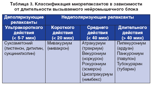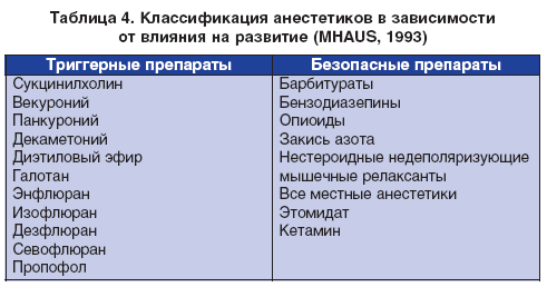 Триггерные агенты. Препараты, способные провоцировать ЗГ, называются триггерными агентами. Традиционно триггерными считают деполяризующие миорелаксанты (сукцинилхолин) и галогенсодержащие ингаляционные анестетики, например галотан, десфлюран [10, 23]. Деполяризующие миорелаксанты, по структуре напоминающие ацетилхолин, взаимодействуют с Н-холинорецепторами и вызывают потенциал действия мышечной клетки (табл. 3). Эффект деполяризующих мышечных релаксантов (сукцинилхолина, листенона, дитилина) связан с тем, что они действуют на постсинаптическую мембрану подобно ацетилхолину, вызывая ее деполяризацию и стимуляцию мышечного волокна. Однако, в отличие от ацетилхолина, деполяризующие миорелаксанты не гидролизуются ацетилхолинэстеразой, и их концентрация в синаптической щели достаточно долго не снижается, что вызывает длительную деполяризацию концевой пластины, которая приводит к миорелаксации.