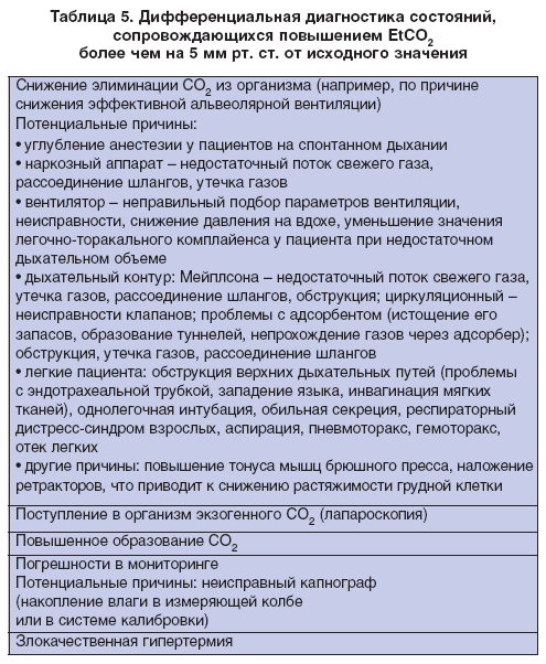 PetCO2, СО2 вдоха остается нулевым (рис. 1). Повышение ЕtСО2 – наиболее достоверный клинический признак ЗГ. Любое увеличение ЕtСО2 на 5 мм рт. ст. и более сверх установленной нормы должно быть тщательно проанализировано. Некоторые случаи ЗГ в самом начале не всегда сопровождаются увеличением ЕtСО2 сверх нормы. Это может быть связано с гипервентиляцией, погрешностями при измерении ЕtСО2 или наличием большой разницы между показателями ЕtСО2 и концентрации СО2 в артериальной крови. ЗГ приводит к росту ЕtСО2, однако в таблице 5 приведены и другие причины повышения ЕtСО2.