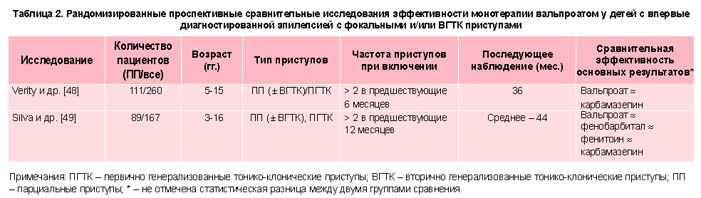 Проведен обзор отдельных категорий многочисленных исследований вальпроевой кислоты соответственно основным типам приступов, дизайну исследования и достоверности [12, 37].