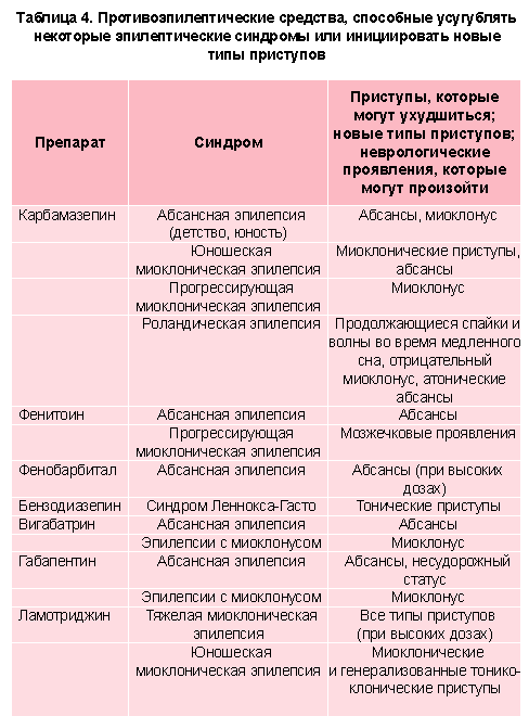 У детей, страдающих эпилепсией, часто встречаются периоды ухудшения течения приступов и могут появиться как спонтанно, так и быть спровоцированными побочными эффектами ПЭП (либо связанные с дозировкой, либо с идиосинкразией). Тем не менее, существуют очевидные основания того, что ПЭП способны провоцировать аггравацию (табл. 4) посредством простых фармакодинамических механизмов.