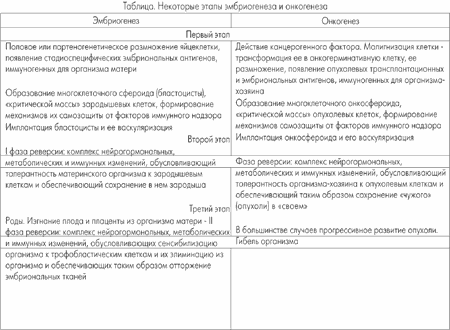 Сотрудниками Института сформулирована онкогерминативная гипотеза опухолевого роста (В. Б. Винницкий, 1990), которая, с позиций основных законов эволюционной биологии и биологии развития, объясняет природу биологических свойств злокачественных клеток, феномен гетерогенности злокачественной опухоли как основы ее прогрессии. Не останавливаясь на положениях онкогерминативной гипотезы, которая, как результат глубокого осмысления биологической природы злокачественной клетки и опухоли, требует отдельного рассмотрения, приведем основные сущностные этапы эмбрио- и онкогенеза, указывающие на сходство и отличия этих двух процессов на уровне организма (табл.).