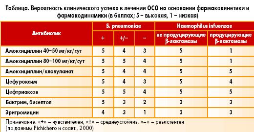 Одним из основных и в то же время обсуждаемых методов лечения ОСО, РОСО и ЗОСО остается антимикробная терапия, причем первоначальный выбор антибиотика, как правило, бывает эмпирическим, что можно отнести к недостаткам антибиотикотерапии. Кроме того, недостатком системной антибиотикотерапии является возможность развития известных нежелательных явлений. Один из последних опубликованных метаанализов «Естественная история среднего отита без лечения» на основе опубликованных исследований по вопросу разрешения ОСО содержит следующие результаты. По данным метаанализа, у 61% детей симптомы ОСО разрешались в течение 24 часов, у 80% детей – к третьему дню без применения антибиотиков. Частота встречаемости гнойных осложнений не отличалась в зависимости от того, принимали пациенты антибиотики или нет. Поэтому назначать антибиотики следует после периода выжидания в течение 2-3 дней при отсутствии серьезных системных симптомов (рвота, нарастающая головная боль). Не все формы ОСО требуют назначения антибиотиков, но лечение антибиотиками снижает риск развития мастоидита и других осложнений. В связи с этим считается обязательным назначение антибиотиков во всех случаях ОСО у детей младше двух лет, а также у пациентов с иммунодефицитными состояниями. Назначение антибиотиков необходимо при ЗОСО и РОСО. Эмпирический выбор антибиотика должен учитывать спектр типичных возбудителей ОСО, ЗОСО, РОСО, каковыми являются пневмококк, гемофильная палочка, а в некоторых регионах еще и моракселла. Оптимальным может быть выбор с учетом данных о региональной чувствительности предполагаемых возбудителей к антибиотикам (табл.), но в России эти данные не всегда достоверны и доступны лишь в отдельных регионах.
