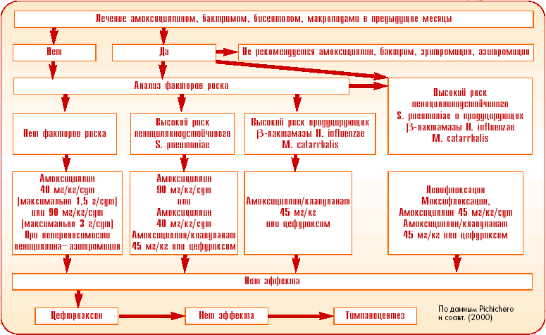 С учетом типичных возбудителей и российских данных об антибиотикорезистентности препаратом первого выбора при ОСО является амоксициллин. Адекватная доза для детей составляет 80-90 мг/кг/сут, для взрослых – 3-3,5 г/сут, разделенная на три приема независимо от еды.