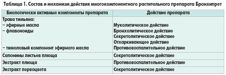 Бронхипрет является многокомпонентным растительным препаратом, состав и свойства которого представлены в таблице 1. Препарат обладает приятными вкусовыми качествами, не содержит искусственных красителей.