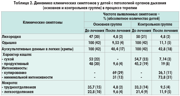На фоне проводимой базисной патогенетической терапии к 7-му дню у детей обеих групп была получена положительная клиническая динамика. Более быстрая динамика отмечалась у детей основной группы (в 2 раза). Об этом свидетельствовали улучшение общего состояния и самочувствия, нормализация лихорадки, уменьшение или исчезновение одышки и катаральных явлений в легких (табл. 2).