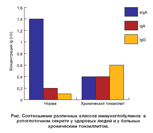 Одной из ведущих функций миндалин является обеспечение защиты слизистых оболочек дыхательных путей и глаз секреторными антителами классов А и М, которые проходят через эпителиальные барьеры и связывают микроорганизмы (О.Ф. Мельников и соавт., 2002). Механизм формирования гуморального иммунитета слизистых оболочек представляется следующим. В миндалинах происходит отбор из кровотока «наивных» В-лимфоцитов и формирование из них клеток, продуцирующих антитела против микроорганизмов, попадающих в дыхательные пути. Так, за сутки небная миндалина обновляет свой клеточный состав на 30%. Клетки, контактировавшие с антигеном, способны заселять слизистые оболочки дыхательных путей и глаз, железы и синтезировать специфические секреторные иммуноглобулины (Brandtzaeg, 1995). При ХТ уровень секреторного иммуноглобулина А (IgA) в ротоглоточном секрете снижается по сравнению со здоровыми пациентами в 1,5-3 раза у 70,0% (рис.). Хроническое воспаление миндалин, особенно небных, характеризуется также снижением числа рецепторов к ряду регуляторных пептидов-цитокинов, уменьшением формирования комитированных В-лимфоцитов – будущих продуцентов IgA.