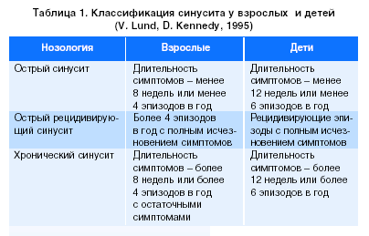 По длительности заболевания различают следующие формы синусита: острый, рецидивирующий острый, хронический (табл.1).