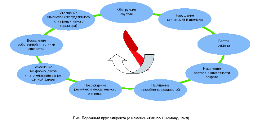 Принято говорить о так называемом порочном круге процессов, возникающих в пазухах при обтурации соустий (рисунок).