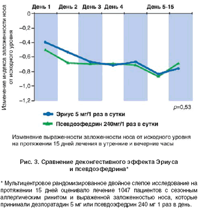 антигистаминные препараты. Блокируя гистаминовые рецепторы, они тем самым препятствуют развитию негативных проявлений: отека слизистой оболочки, зуда, пропотевания экссудата через сосудистую стенку и т. д. Однако не все антигистаминные препараты одинаково эффективны. По данным журнала «Daly Allergy», из всех антигистаминных препаратов наиболее эффективно устраняет заложенность носа Эриус (дезлоратадин) – единственный антигистаминный препарат, деконгестивный эффект которого сопоставим с эффектом псевдоэфедрина (рис. 2, 3). Это связано, во-первых, с наибольшим сродством Эриуса к Н1-гистаминовым рецепторам и его мембраностабилизирующим действием, которое предотвращает высвобождение преформированных медиаторов из тучных клеток и базофилов, а во-вторых – с ингибирующим действием на целый комплекс медиаторов воспаления (цитокинов, хемокинов, молекул адгезии и т. д.) [5].
