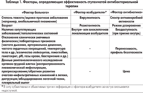 В реализации концепции ступенчатой антибактериальной терапии необходимо учитывать несколько факторов, а именно «фактор больного», «фактор возбудителя» и «фактор антибиотика» [1] (табл. 1).